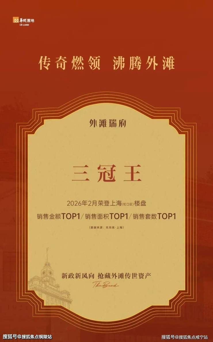 这是项目官方发布的海报,外滩瑞府荣膺2026年2月虹口区新房三冠王。