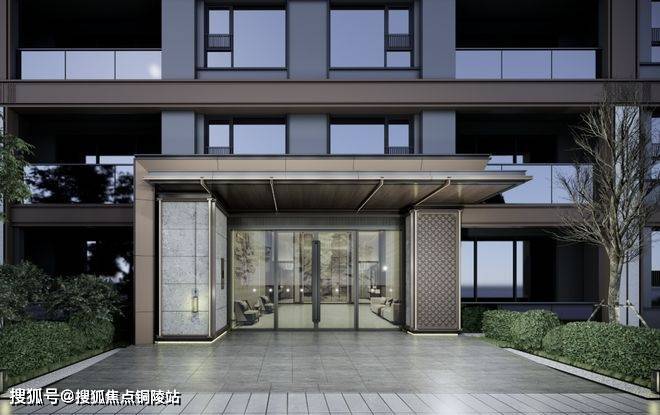 项目建筑外立面主色调为香槟金色与灰色相结合,单元入口部位使用蓝眼睛石材及香槟金色金属;更独特的是,项目将东方飞檐元素融入现代美学立面,形成不落俗套,气质清闲,典雅高贵的现代建筑形象,截取现代潮流元素的同时,亦不失东方大气恢弘之势。