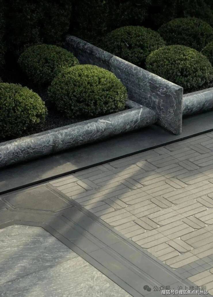 铺装延续柔和基调,米灰调石材温润而富有细腻变化,营造出高级的材质感受。图案上,景观转译了建筑的八边形语汇,通过现代手法将其咬合搭接,既延续了装饰艺术的基因,亦增添了一分时髦的未来气息。