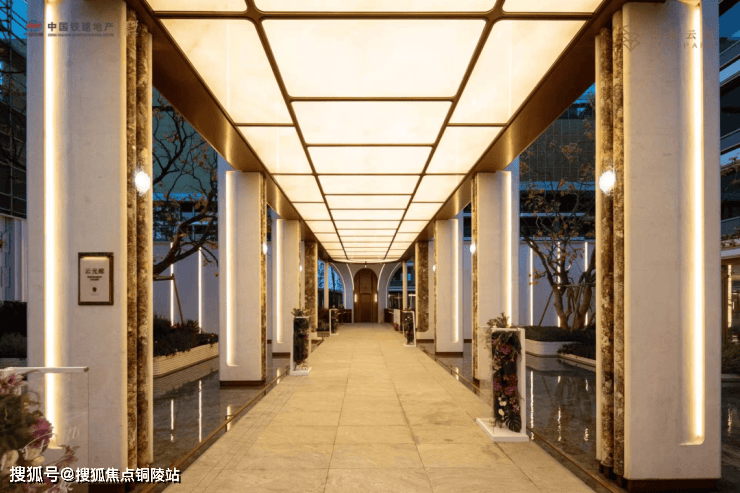 独创双桥跨水归家系统,3米宽人行桥与7米宽车行桥平行横跨约400米水岸,彻底实现人车分流;步行过桥直达约9米挑高、36米宽鎏金门庭,整面天然奢石背景墙搭配定制艺术雕塑,两侧点缀景观绿植。
