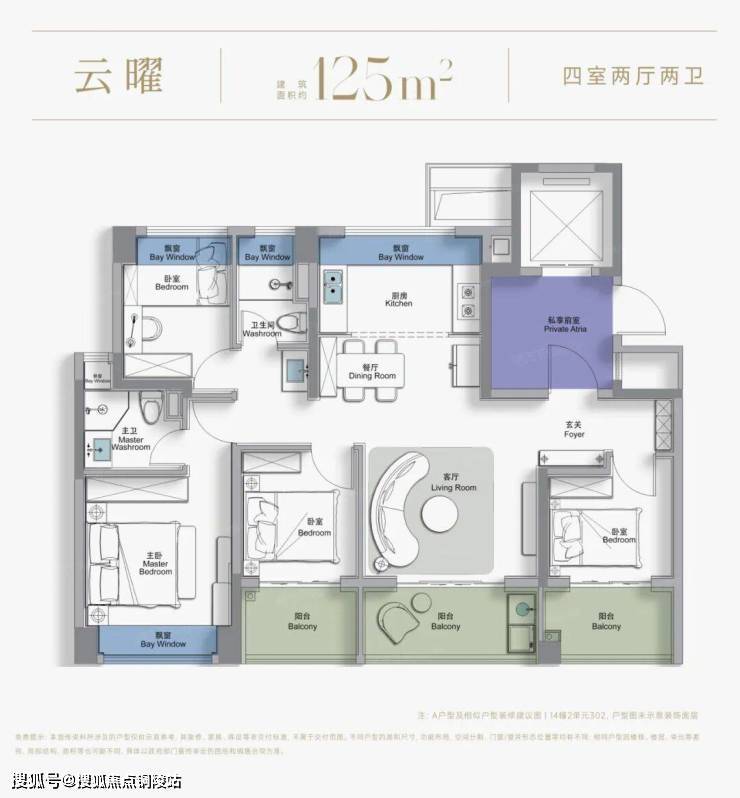 小高层125㎡户型:四开间朝南,南北通透,一梯一户+专属玄关,三阳台(约15㎡)+多飘窗,3米层高,适合三口之家。