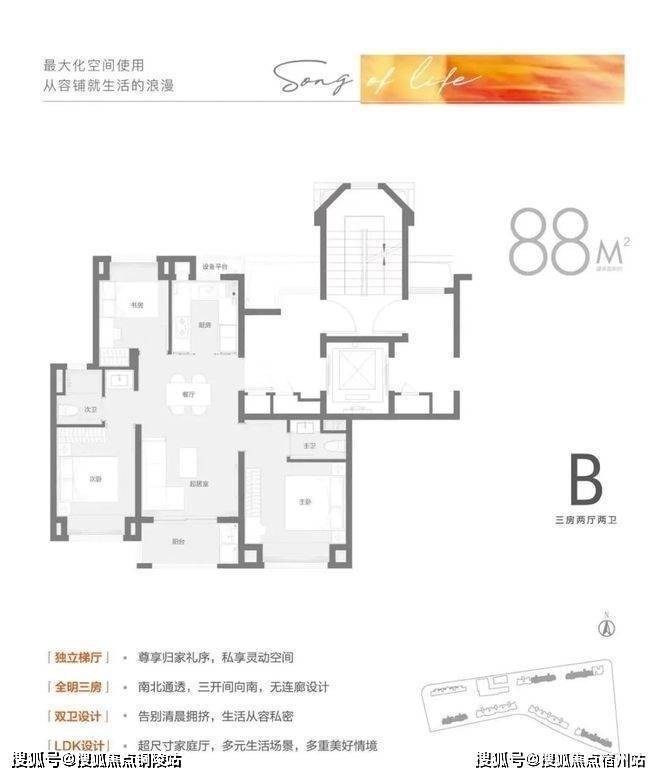 相较于市面上普遍的建面约88㎡只能做3房1卫的设计,该户型竟做到惊人的3房2卫!