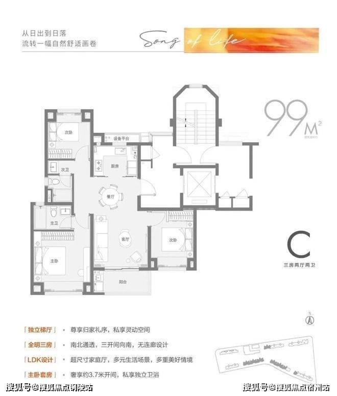 建面约99㎡3房2卫户型不仅保留三开间朝南和餐客厅一体化的优势,更在尺度上大踏步进阶。