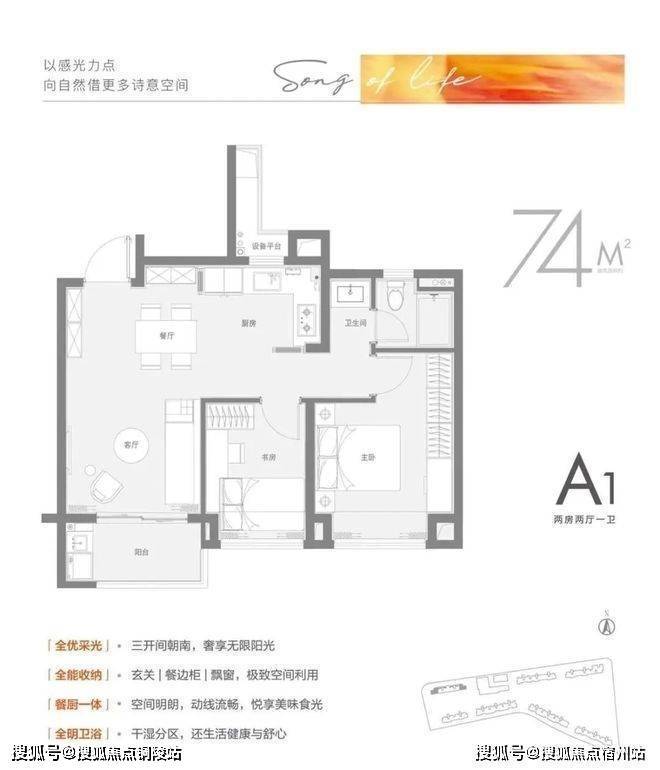 建面约74㎡2房竟做到三开间朝南,其中两卧均朝南,同时面宽甚至大于进深,这比同类产品卧室一南一北狭长布局要舒适得多。