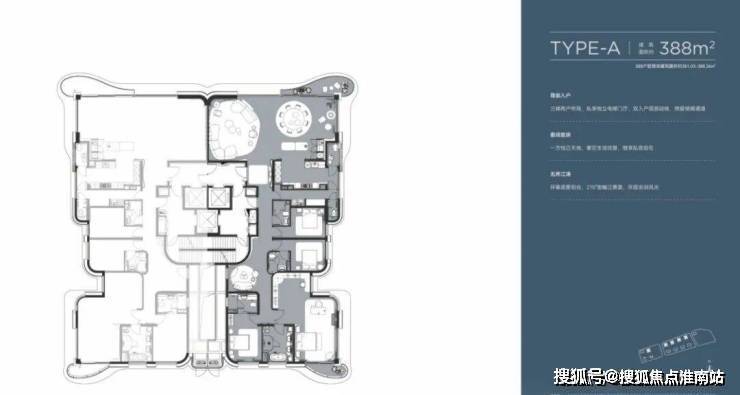 约388㎡一线江景大平层作为“藏品级”户型,约13米的惊人面宽冠绝上海,一些450㎡以上大户型,亦无如此阔绰尺度.客餐厅实际面积接近约100㎡,约3.5米轩朗层高,领先第四代住宅“国标”.南北双270°弧形转角环幕阳台,北望江景,南拥园景.3梯2户设计,双入户洄游动线,保姆动线与主人动线分离,顶豪该有的尊崇感被诠释得淋漓尽致.