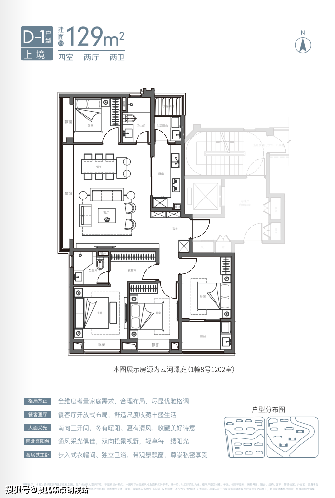 总体来看,这样一套约129平的户型做到四房两厅两卫,做到市面上极度稀缺的边厅设计,采光面、景观效果都极佳。户型整体没有浪费面积、利用率高,设计非常合理。