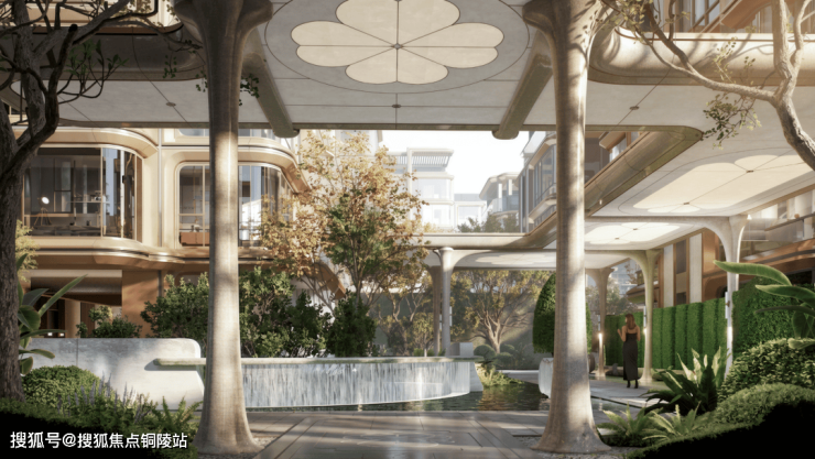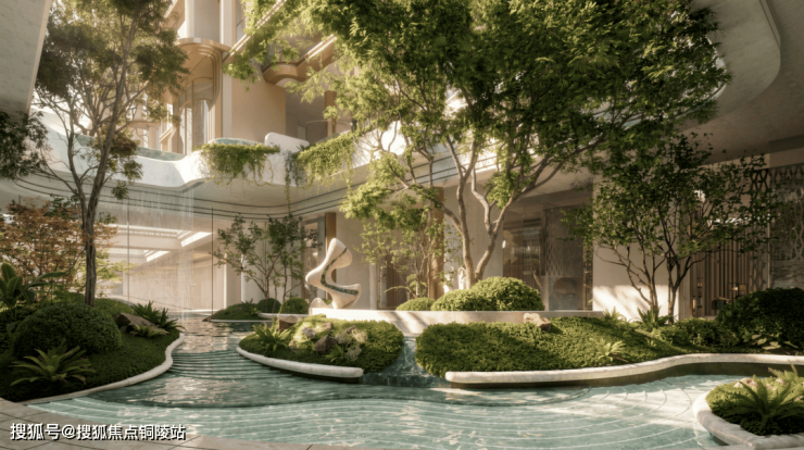项目在抬板设计之余,还利用抬升形成的台地空间,来打造下沉式庭院,通过叠水、绿植的搭配,形成立体景观,这种一步一景的沉浸式森系园林,进一步体现项目自身森系园林景观。