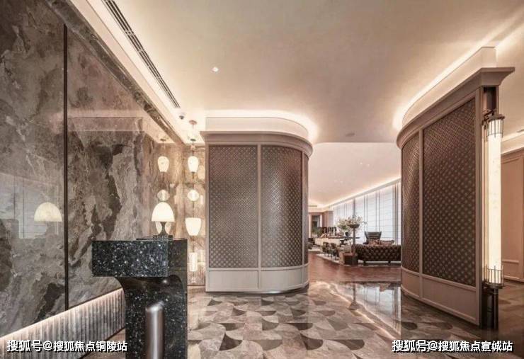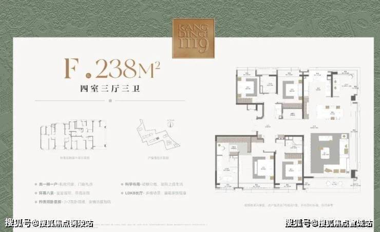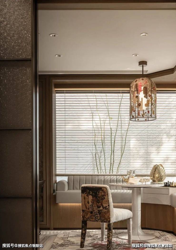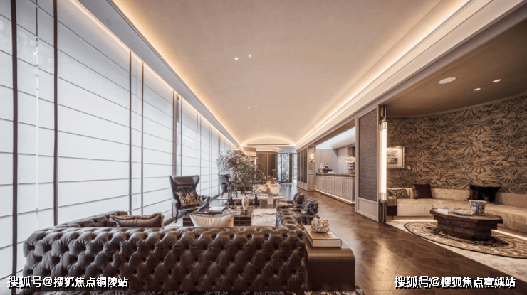 约17.2米环绕观景台:约238㎡户型的客餐厅,位于户型的顶端。自东向南环绕270度的观景台长达约17.2米,在这样的客厅,甚至可以踱步欣赏窗外的满眼梧桐。独立会客厅,可以做小茶室或棋牌,更深一步的隐私感,为专享客群定制。