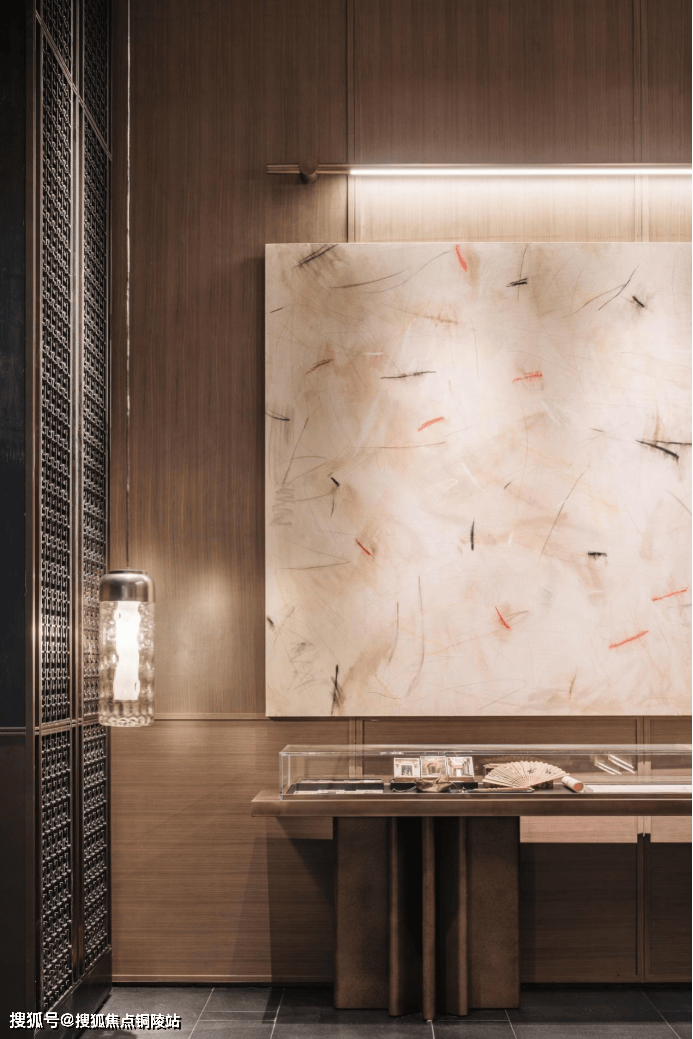 例如,在归家的动线上,保利以古代“提灯夜游”为灵感,将“灯”这一意向穿插其中——在公区入户大堂内,造型别致的壁灯格外惹眼,其灵感来自于“中国古典豆形灯”;落壁灯则是以古铜不锈钢搭配仿透光云石灯具,营造出朦胧的光晕氛围,颇具东方意蕴。