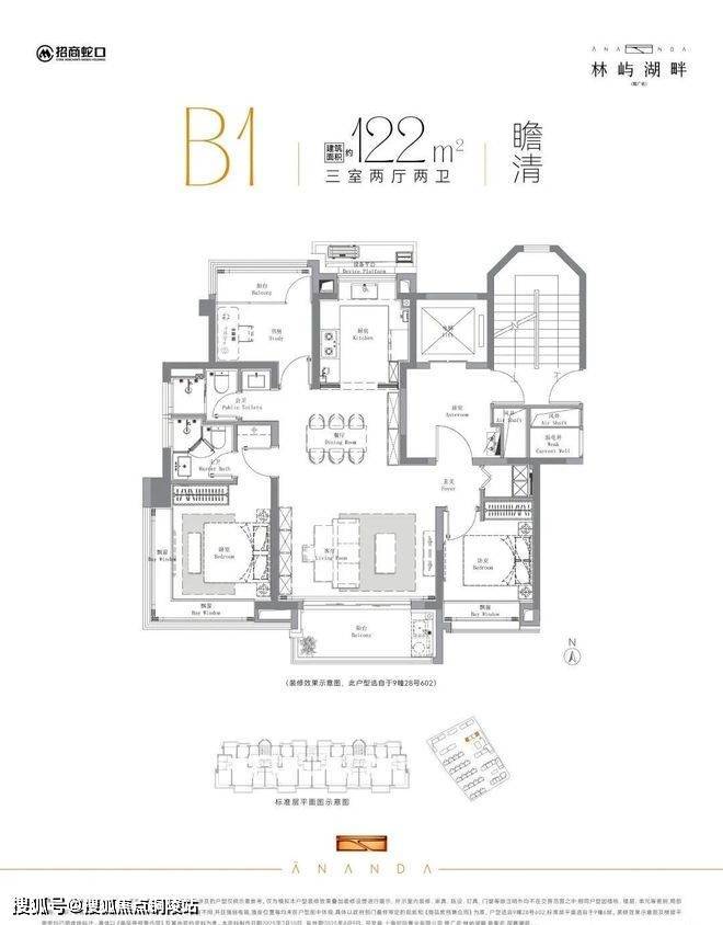 该户型分布在6号楼、9号楼、11号楼以及13号楼,其中9号楼位置最佳,南向楼间距约46米,下沉式庭院景观一览无余,下楼即达会所空间!