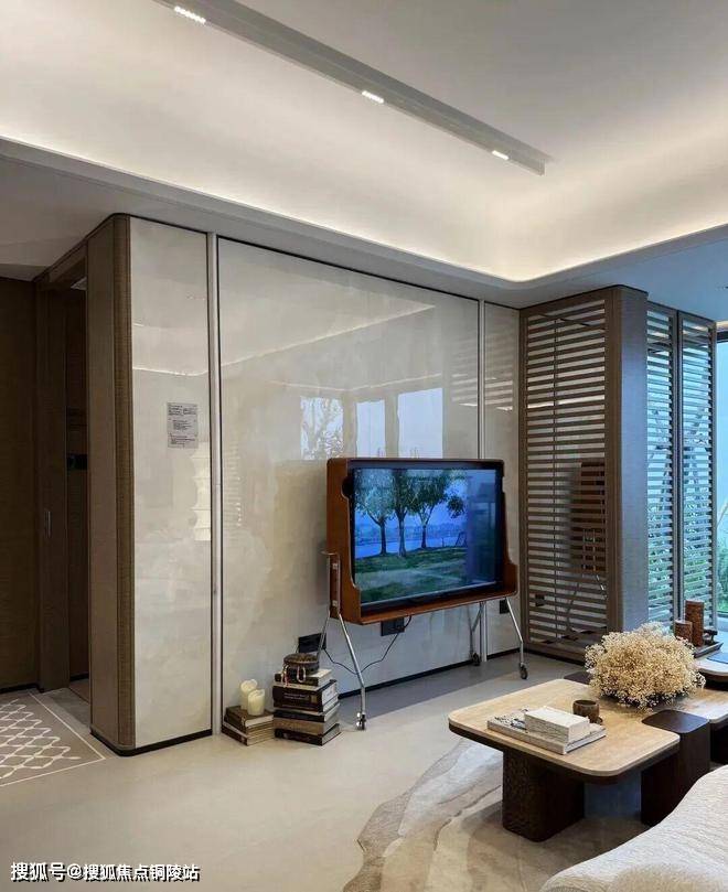 约5米面宽横厅,多出来一个灵动空间,可根据个人需求定制为开放式书房、茶室等;岩板+金属饰面电视背景墙同样为交付标准;
