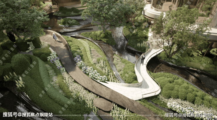 项目拥有罕见立体景观“城市山林”社区,在全域抬板约4米的基础上,项目又下挖,形成罕见垂直落差。依托这一独特地形,项目打造“沿街古树花园+板上浮空花园+板下流石花园”的多层立体景观体系。