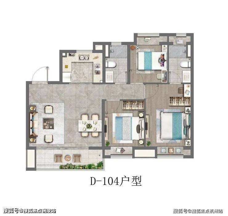建筑面积约104㎡的3房户型,四开间朝南+主卧套房设计+全卧室带飘窗+南北通透+超大的宽面阳台,做出了拥有120㎡以上户型的尺度感和舒适度。如果预算合适,这个户型绝对推荐。
