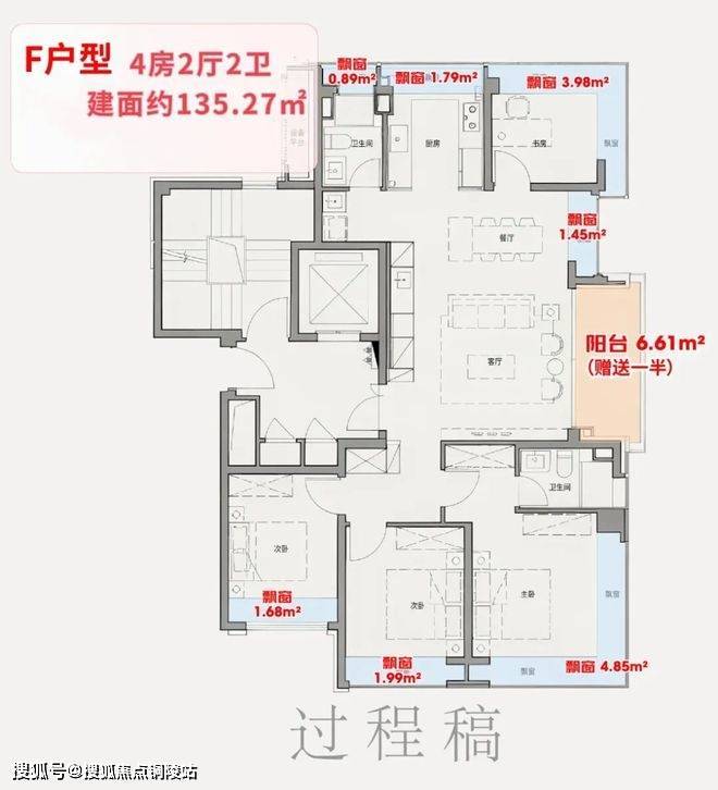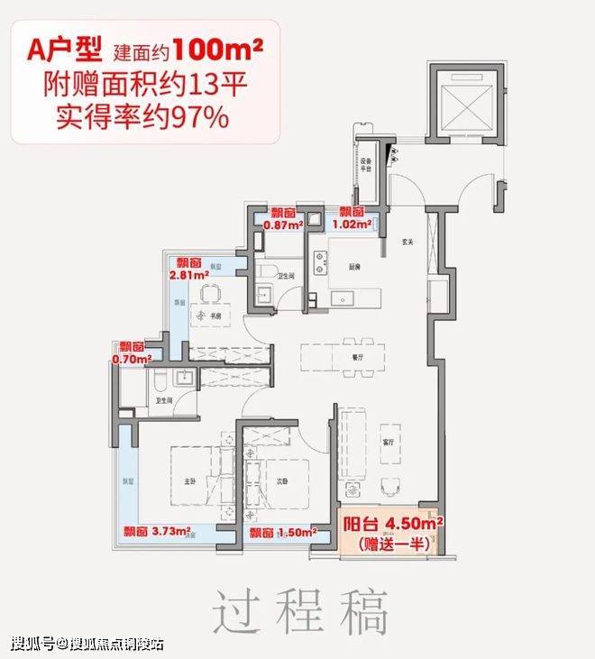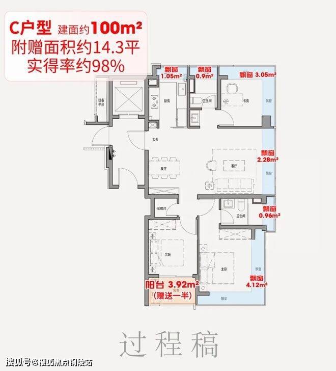 常规百平米户型仅3-4个飘窗,总赠送约6-7平;