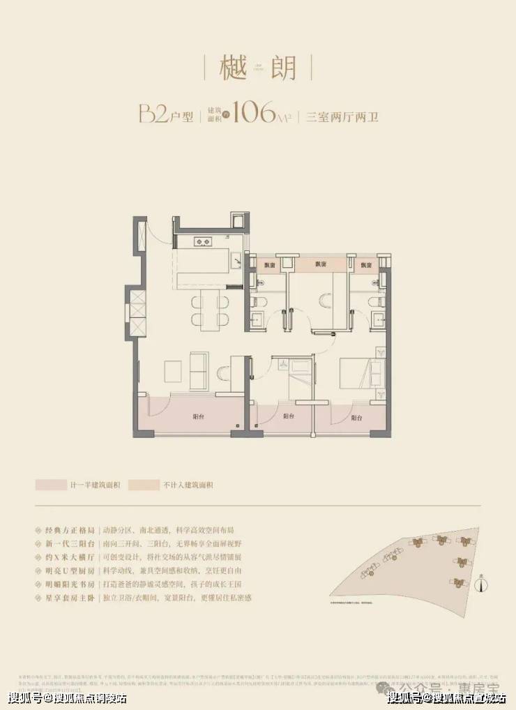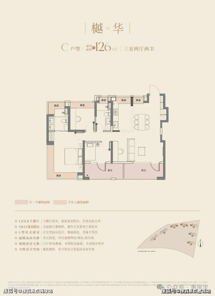 建面约128m3+1房2厅2卫经典动静分离户型,3.5开间朝南+双阳台,阳合仅计算一半建筑面积,主卧以及主卫附赠270°转角飘窗,次卧附赠飘窗且无墙垛!