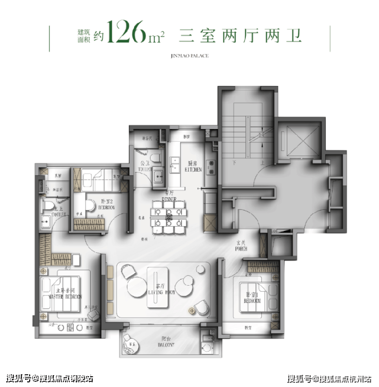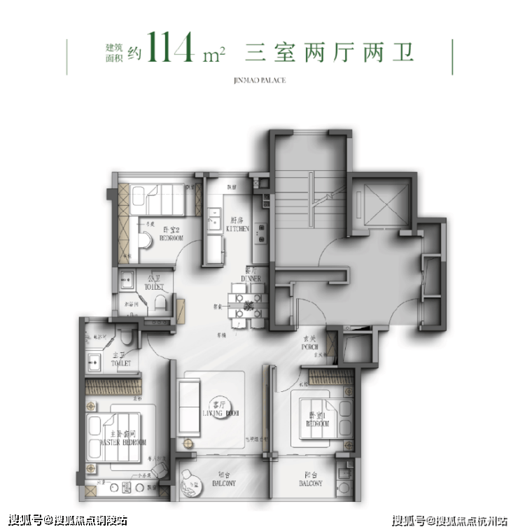 114㎡三房:三开间朝南、南北通透、动静分区,入门金茂府优选,总价约 691 万起。