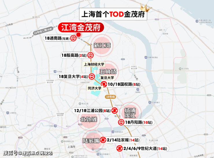 从通南路站(在建)出发,1站就是新江湾,3站财大,4站复旦,5站五角场,7站新华医院,10站杨浦滨江,11站陆家嘴滨江...