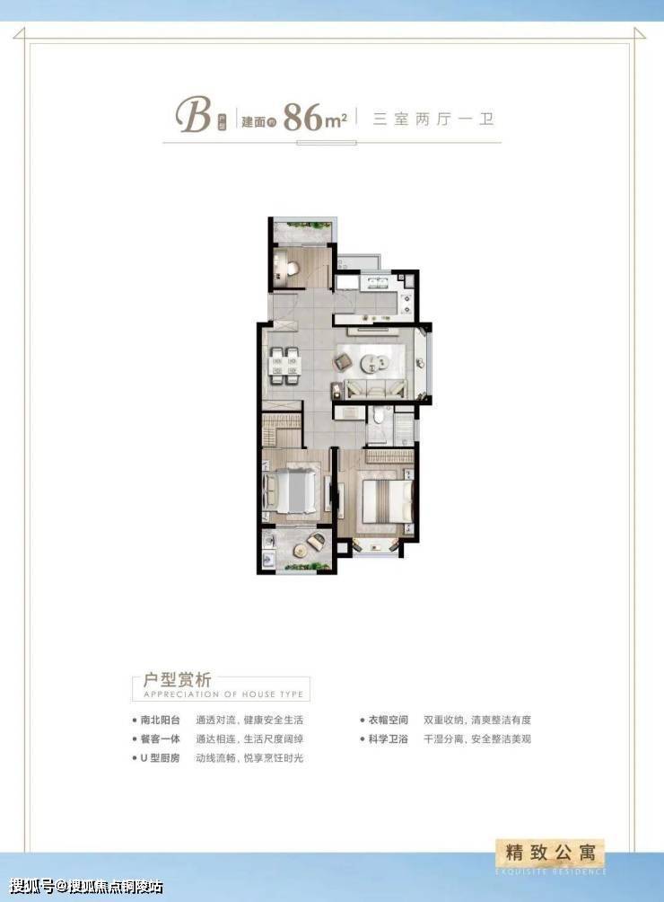 建面约86㎡3房2厅1卫户型特点: 做到了双开间朝南+双阳台设计+卫生间干湿分离,一个非常紧凑的小3房户型。
