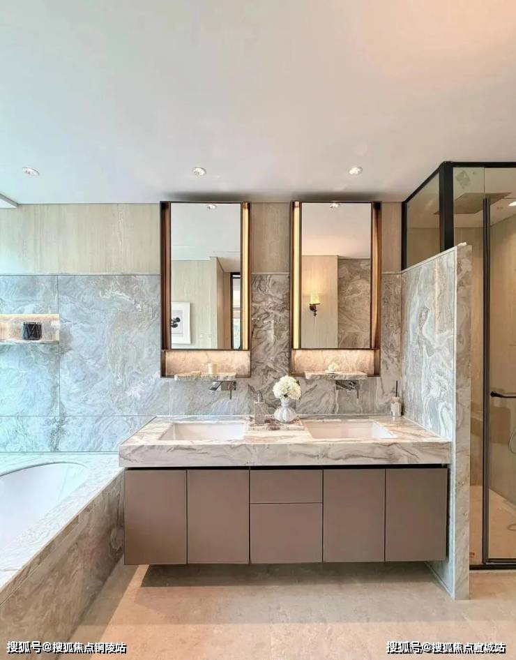 材料选用意大利石材,BVLGARI HOTEL大理石,铝型材塑型红,四层金属网格墙面以及梧桐叶金属屏风等,打造独属老静安的记忆符号,高奢定制,市区豪宅调性拿捏!