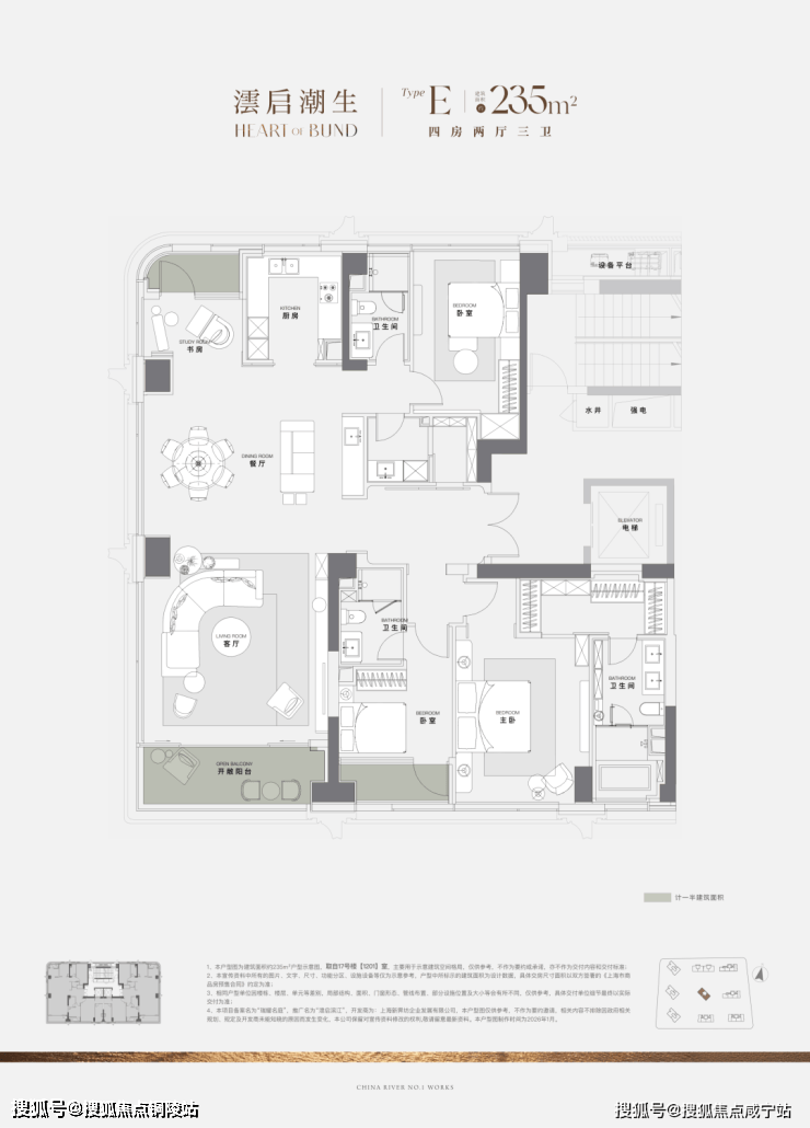 过去10年上海一线滨江住宅,大户型是绝对主流,120㎡级3房产品从未出现。澐启滨江是因2021年后滩九宫格有中小套型指标要求,得以推出120㎡级产品。