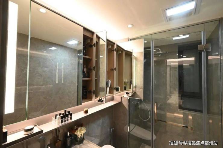 最后值得一提的是,项目还有很多个性化定制设计,包括防雾镜、美颜灯、电热毛巾架、岛台轨道插座(约93㎡户型)、预留美妆冰箱等。