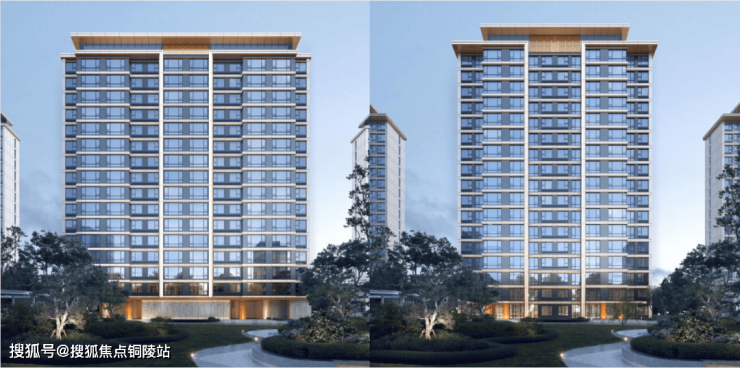 现代风格:立面利用大面积玻璃+阳台落地窗+金属型材+层间装饰提升建筑整体感和精致度,外立面大面采用浅色仿石多彩漆,浅灰色金属格栅,浅灰色玻璃,香槟色金属型材收边形成创造出建筑独有的人与自然、动静结合、丰富美观的轻盈质感,彰显住宅品质