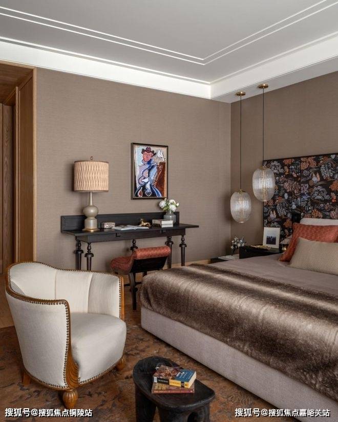 卧室去繁就简,以沉静温暖的配色和材质,营造和平宁静的氛围。 一幅山水花园刺绣屏风点缀其中,予人舒适松弛之感。可移动家具组合,既独立又彼此链接,便于情感交换。