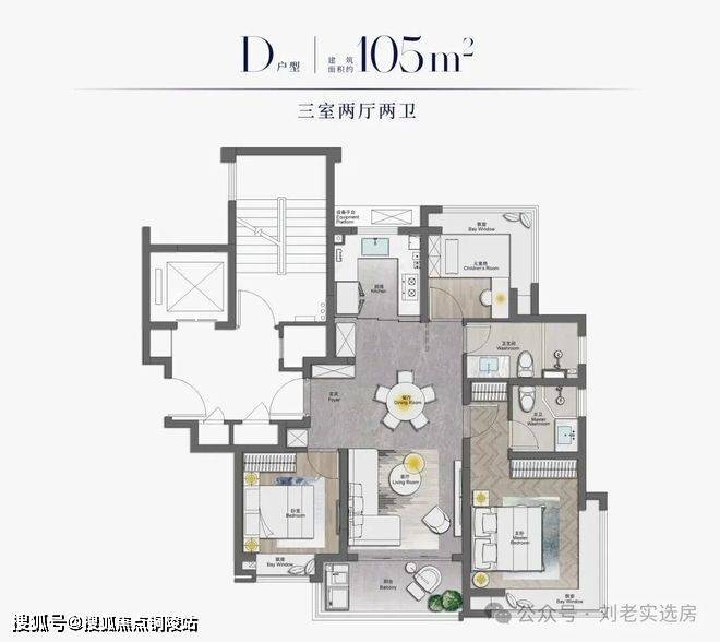 除此之外,边套的建面约105㎡3房户型还打造了南北卧室双约270度转角飘窗的设计,这个实际使用面积相当出众。