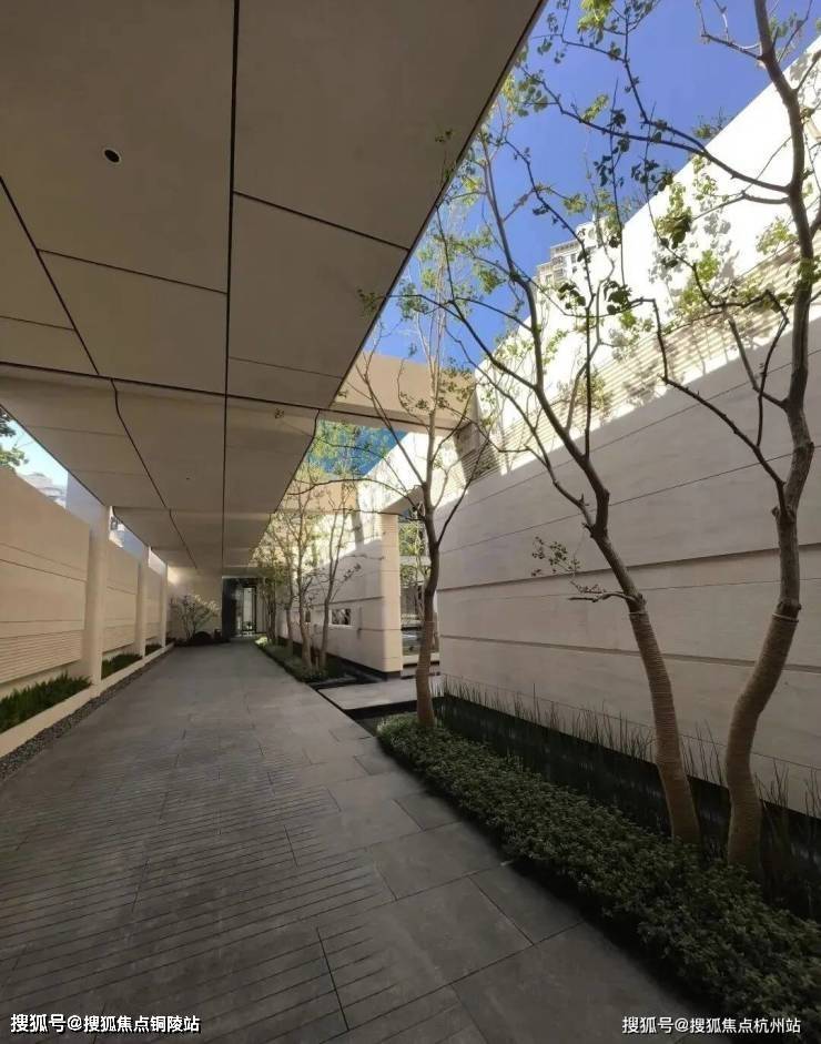 造景的用料也同样考究,大门景墙选用工艺复杂、用料扎实的沙漠风与白海棠石,风雨连廊选用了经过多轮艺术工艺抛光打磨形成的哑光荔枝面的沙漠风石。