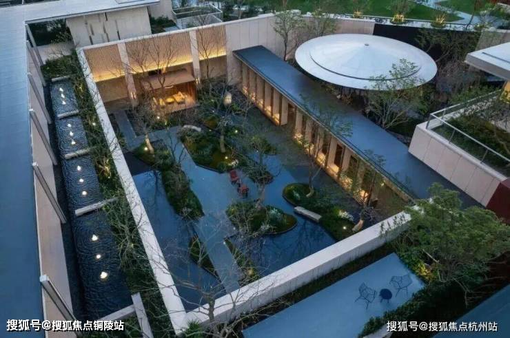 约6米高水幕的下沉式山水庭院,灵动的流水,层次丰富的空间,在自然松弛的氛围中,增添了一丝活泼的趣味。