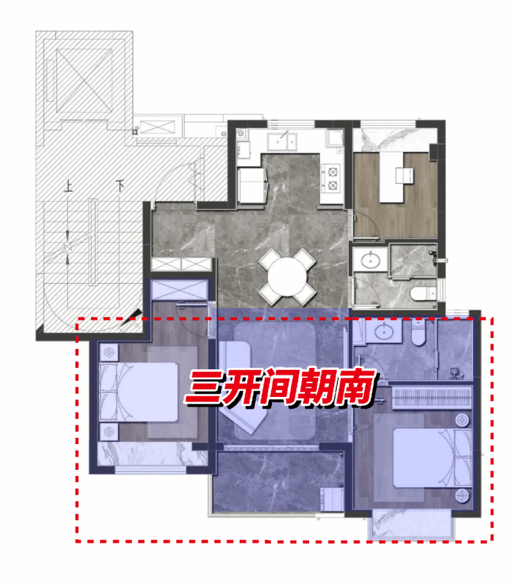 · 建面约100平3房2卫,则适合三代一孩家庭、可满足三代居的功能要求;