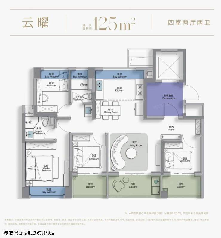 小高层125㎡户型:四开间朝南,南北通透,一梯一户+专属玄关,三阳台(约15㎡)+多飘窗,3米层高,适合三口之家。