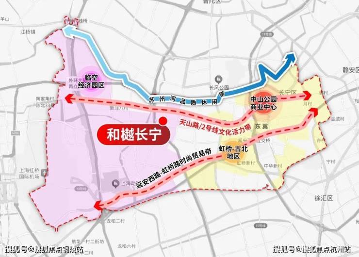 21世纪,伴随着虹桥崛起和2号线的贯通,天山路/2号线双命脉重合,东段承载中山公园CBD商务和天山商圈商业功能,中段聚焦文教居住,西段对接虹桥临空经济区,天山路成为了长宁新时代的中轴线和发展重点。