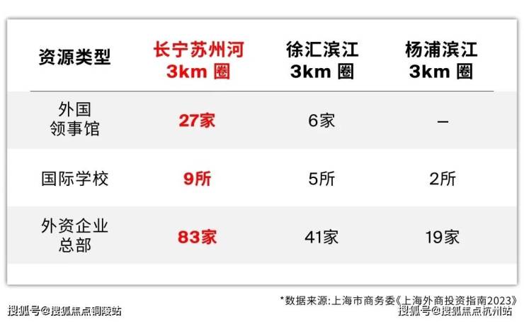 据上海市商务委《上海外商投资指南2023》数据显示,长宁涉外资源密度是徐汇滨江的2-3倍、杨浦滨江的4-10倍,是能够支撑国际客群支付溢价的!