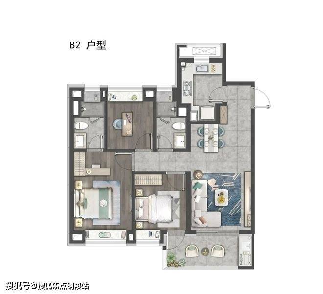 高层99㎡三房两厅两卫(中间套)样板间户型