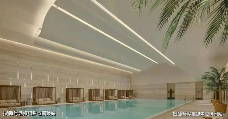 会所内的泳池上方做流畅且立体的吊顶线条,造型现代且富有层次感。这样的设计不仅提升了空间的视觉效果,更营造出一种轻松、悠闲的度假氛围