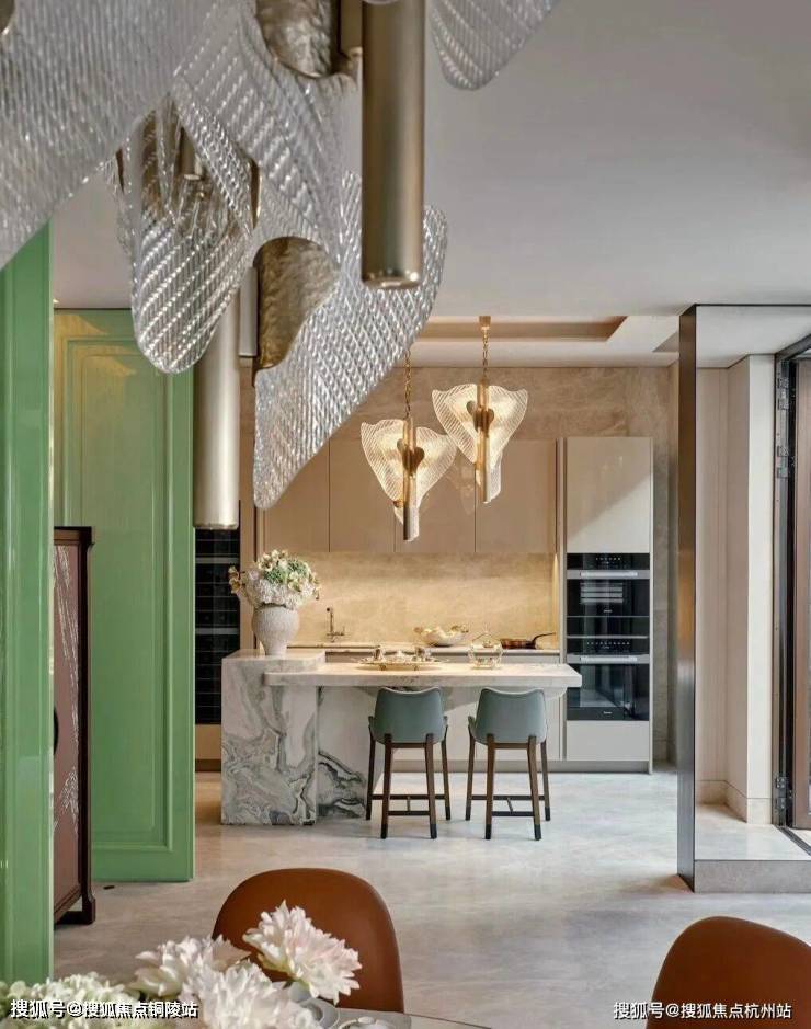 餐厅的设计巧妙融合了老上海的经典元素,圆形餐桌和橘色皮质餐椅在色彩上既现代又充满活力,顶部的水晶吊灯造型灵感来自上海市花“玉兰花”,既增添了空间的华丽感,又巧妙地融入了上海的地域特色。