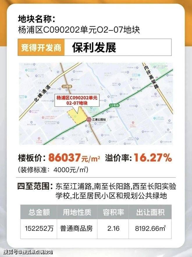 2024年11月28日,保利发展以152252万元竞得杨浦区C090202单元O2-07地块(江浦街道77街坊),溢价率16.27%,楼板价86037元/㎡。