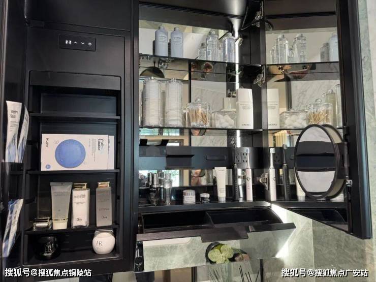 主卫镜柜内置美妆冰箱,还有下方化妆工具的收纳格。
