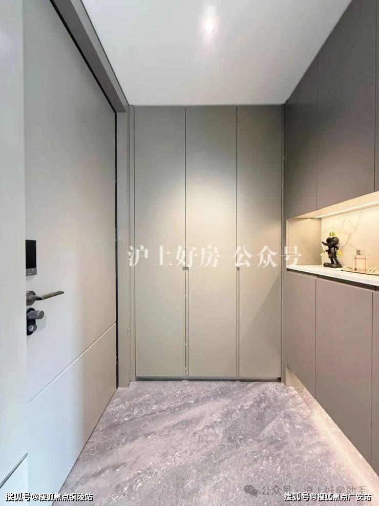 【国誉府】样板间做了F户型128㎡底楼复式和141㎡顶楼复式户型,其中建面约128㎡是三开间朝南户型,入户门从外头看是深色的,转入室内,为了统一视觉效果,门内改成了浅色。