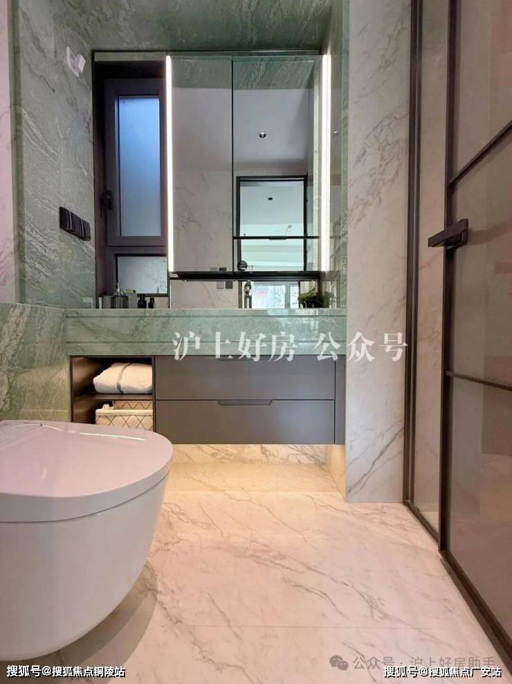 卫生间的洁具都是高仪零售款。主卫部分,目光所及之处几乎全是岩板,这个台面使用的浅绿色大理石也有个好听的名字“只此青绿”。