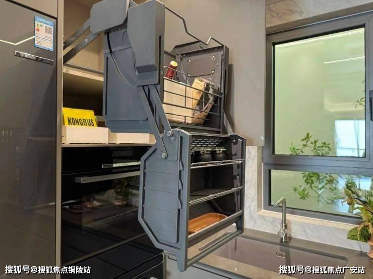 厨房收纳是小编觉得非常实用的款式。比如蒸烤一体机上方的橱柜做了一个下拉篮,下拉后的高度,一个一米六个子的人无需踮脚即可拿到东西。