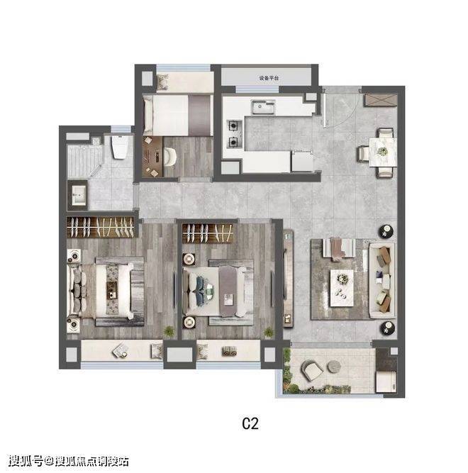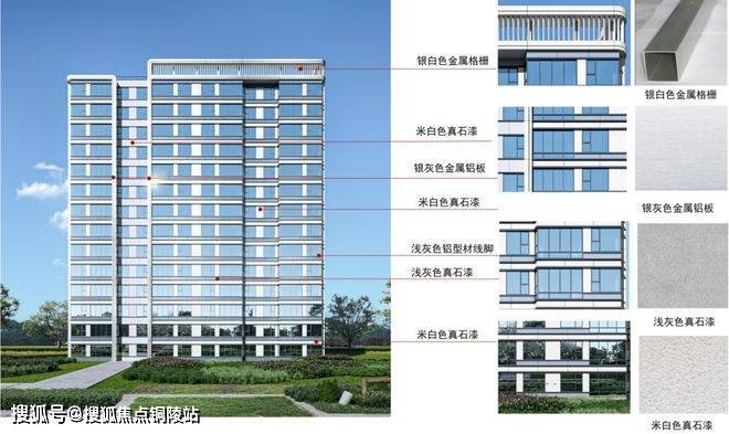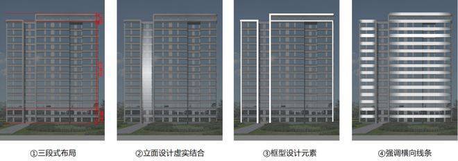 立面采用三段式现代构图,以简洁线条构建骨架,材质与构造呼应水乡记忆:色彩提炼:米白色真石漆与浅灰色铝型材,抽象提取“粉墙黛瓦”的色彩关系。构造还原:通过线脚、材料交接与分缝,还原传统建筑肌理的比例关系。顶部造型:以现代结构重构传统檐角,采用横向线条与冷灰色系,再现水乡建筑檐口的轻盈感。