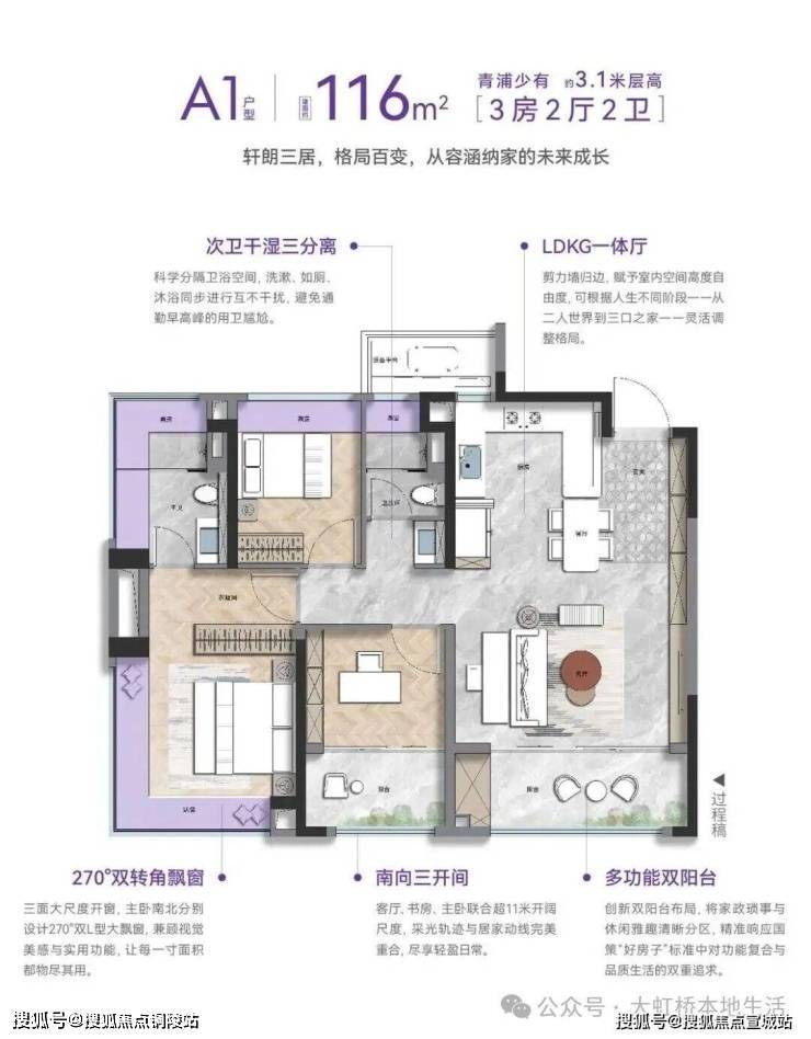 更难得的是,项目全系户型3.1米起步的层高,高于新规要求的3.0米,就算装了中央空调 + 地暖,空间依旧通透不压抑,彻底告别小户型的局促感。