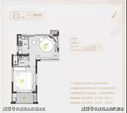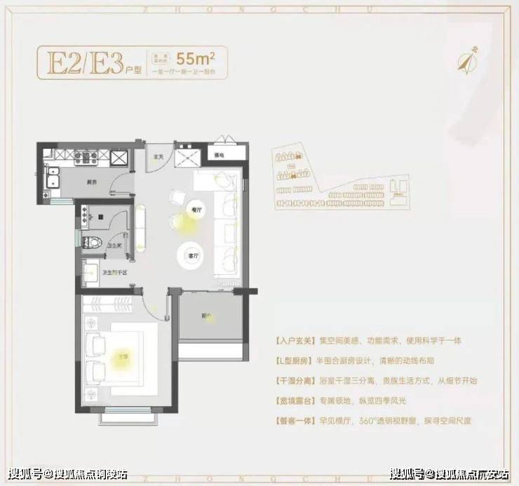 建面约55㎡1房1卫户型,低总价优质上车小户型,做到了双开间朝南+卫生间干湿分离+卧室带飘窗+客餐厅相连,小而美的一个户型。