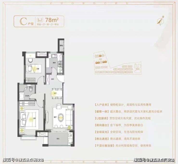 建面约78㎡2房1卫户型,做到了双开间朝南+南北通透+卧室带飘窗+动静分离,功能区划分、动线都非常清晰。