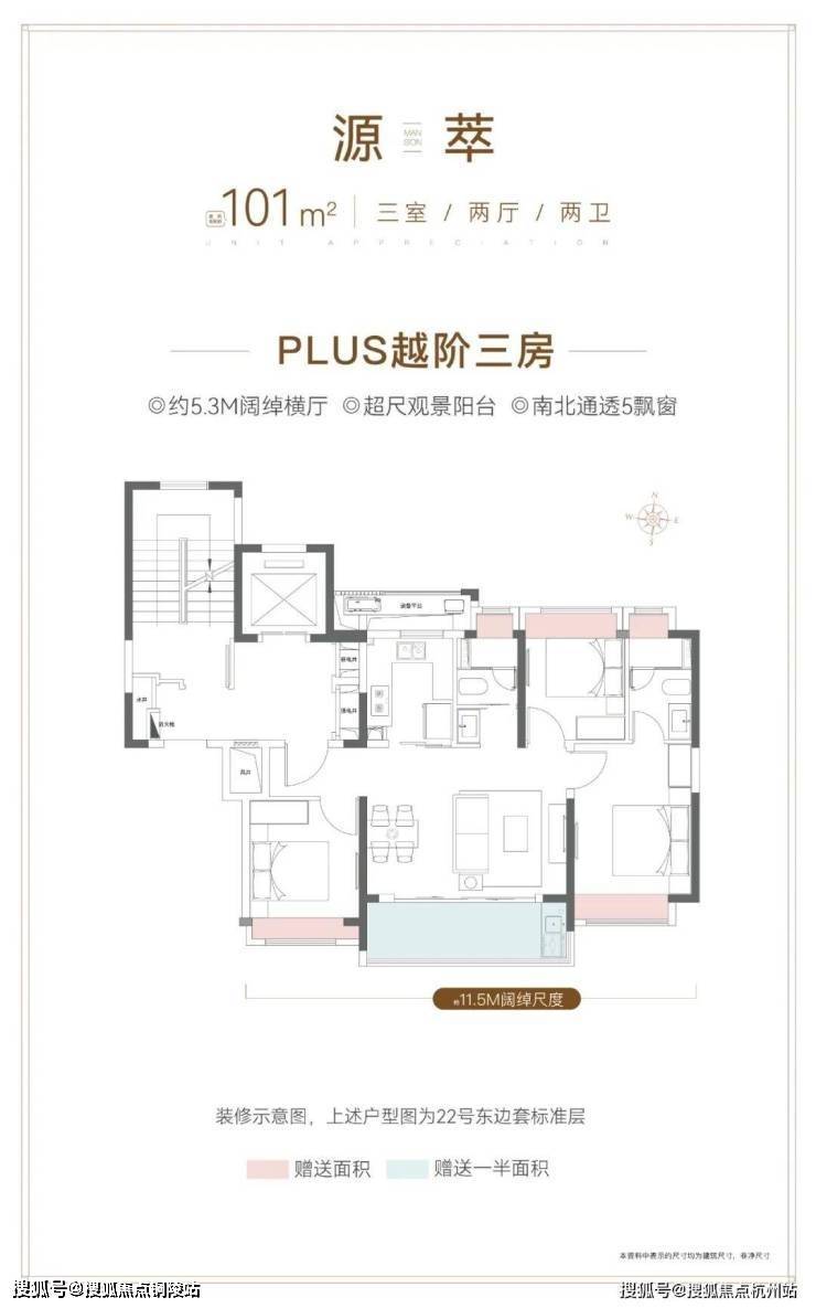 经典飞机户型+三开间朝南+餐客厨一体化+约5.3m的阔绰横厅,整体南向面宽达到约11.5m!整个户型的通透度和采光度很棒。