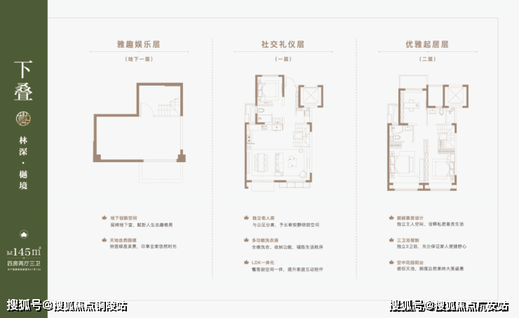 有更大尺度的改善需求,可以选择项目的叠墅产品,主力产品建面约91-132㎡上叠,约113-132㎡中叠,约106-145㎡下叠。