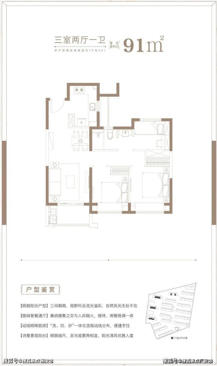 建面约91㎡3房2厅1卫户型,做到了三开间朝南+双朝南卧室带飘窗+动静分离+卫生间干湿分离,采光面拉到极致的小3房户型。