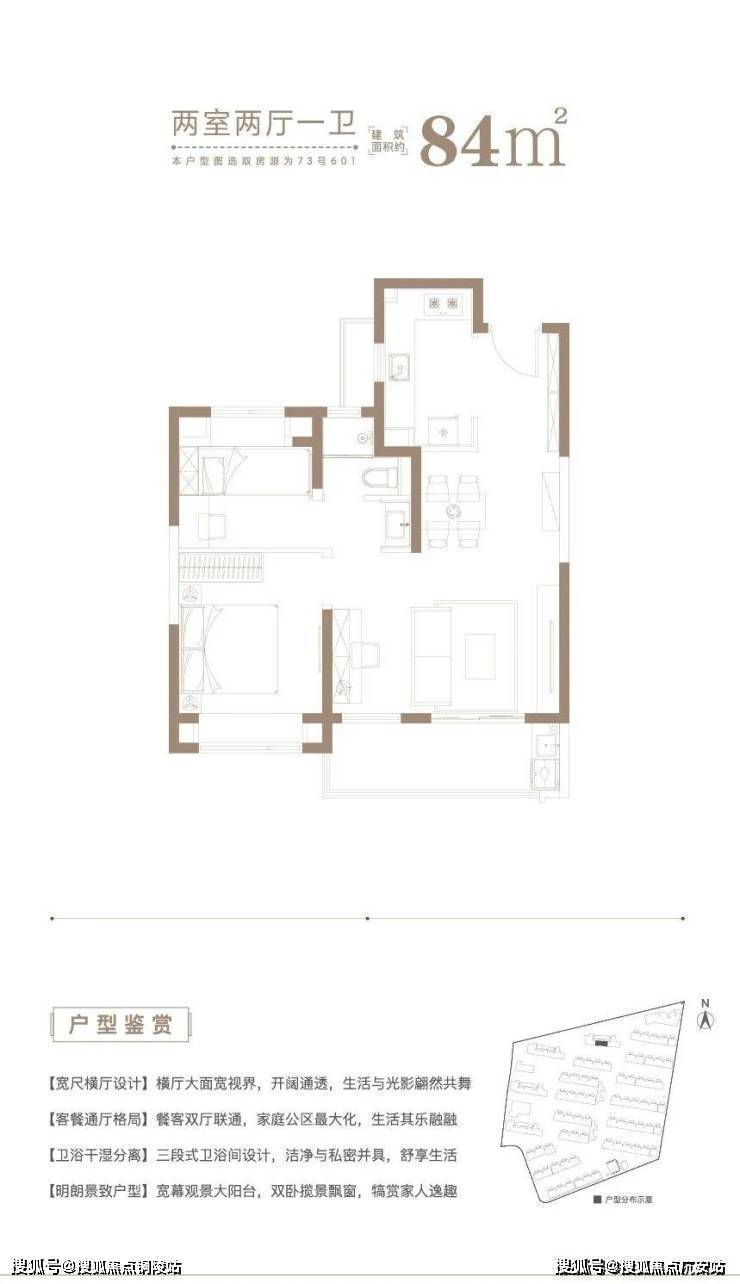 建面约84㎡2房2厅1卫户型,做到了2+1开间朝南+动静分离+卫生间干湿分离,非常紧凑的2房户型。